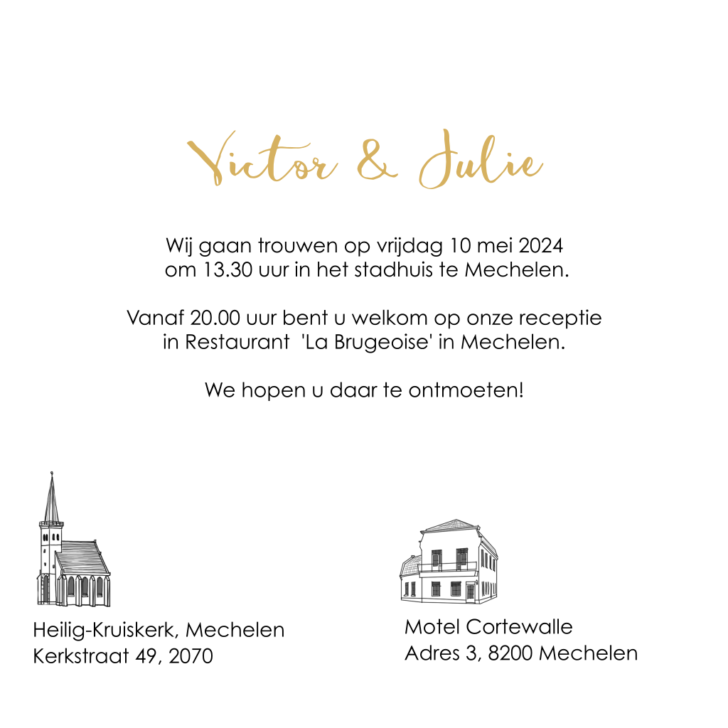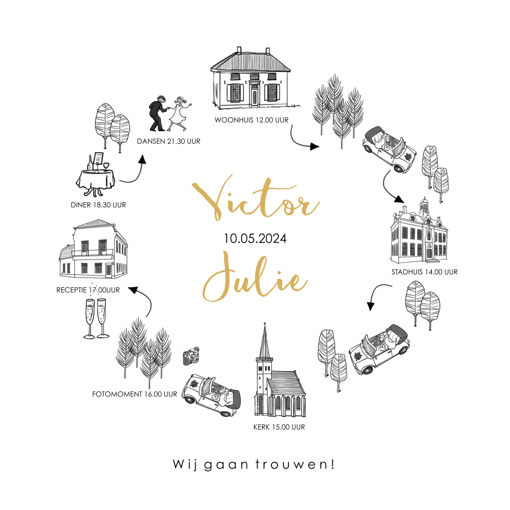 De tekeningen in de cirkel op de voorkant van deze stijlvolle trouwkaart vormen de dagindeling van jullie dag. Samen met de sierlijke letters is dit een originele trouwkaart! De teksten van de kaart kunnen worden aangepast in de online editor.