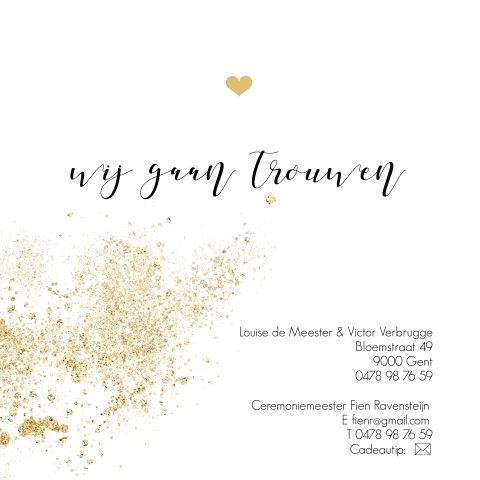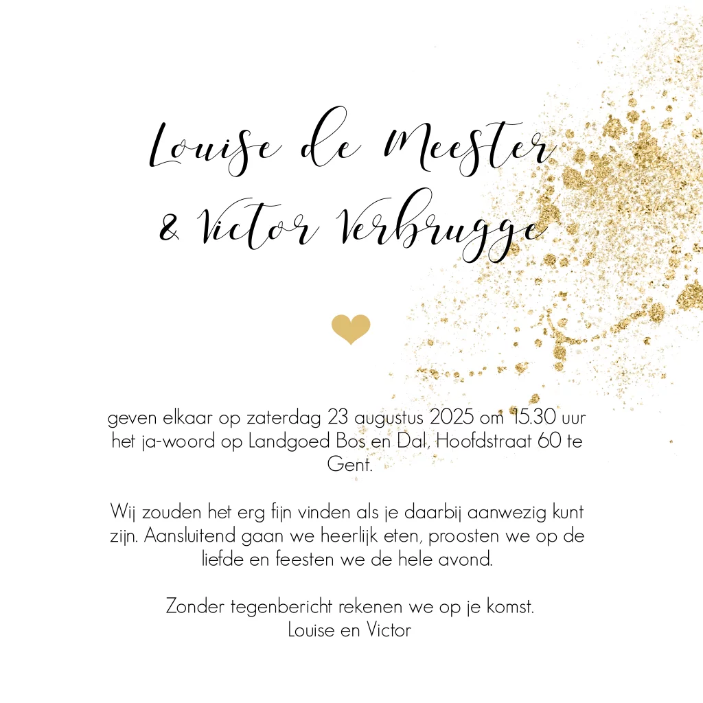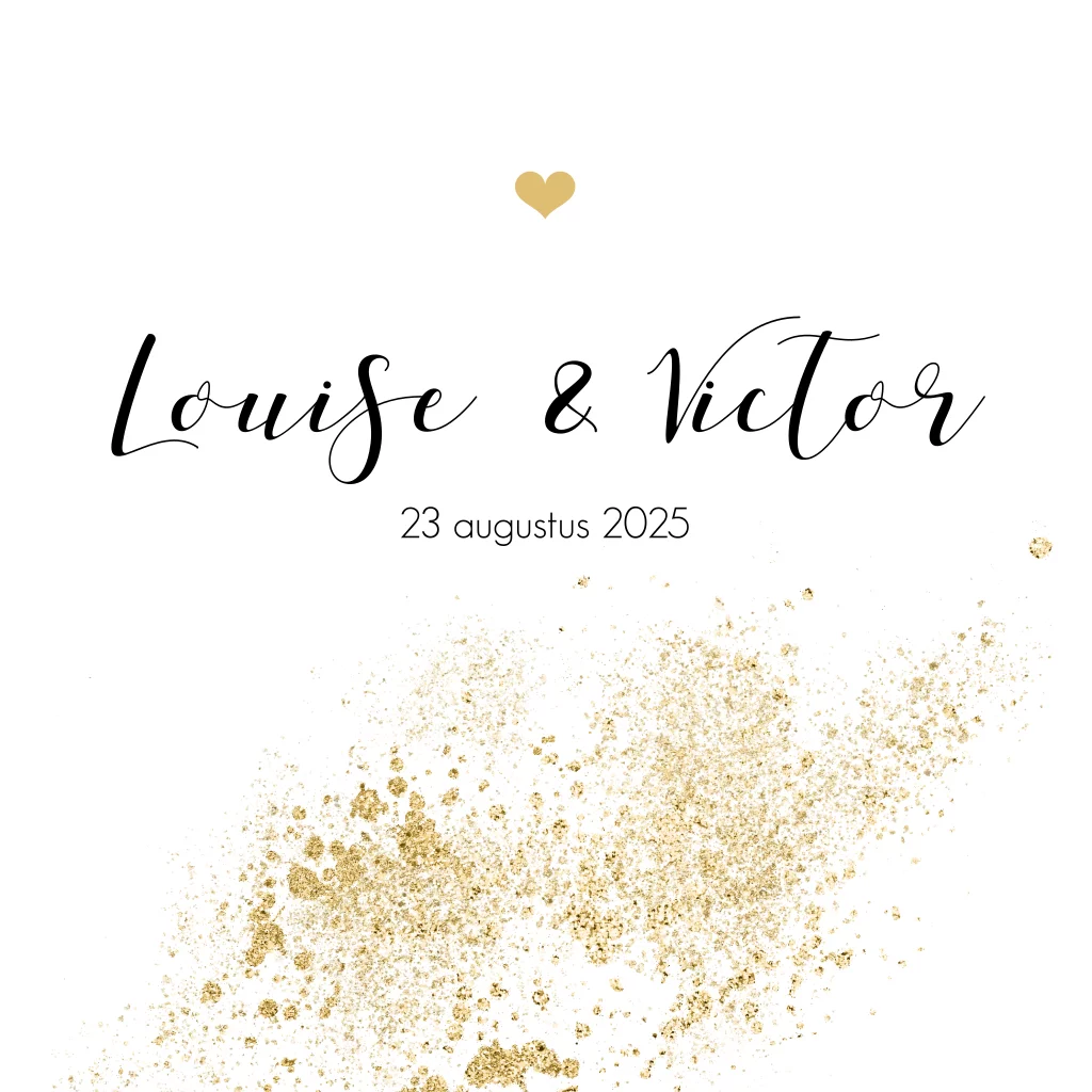 Chique uitnodiging voor jullie huwelijk met gouden verfspetters op een witte achtergrond. Op de voorkant staat een klein, gouden hartje en de teksten staan in een sierlijk lettertype waardoor het een stijlvolle kaart wordt. Je kunt kleuren, teksten en afbeeldingen naar eigen wens zelf aanpassen in de online editor. Zo gedaan!