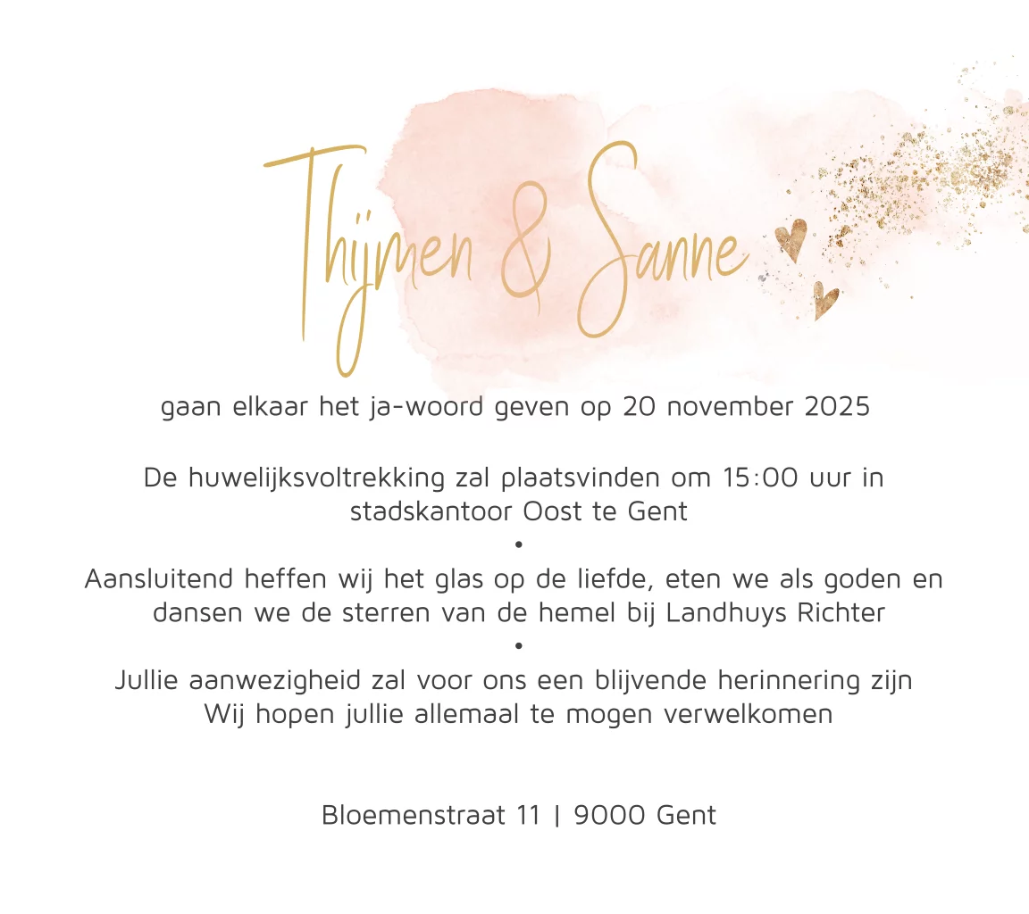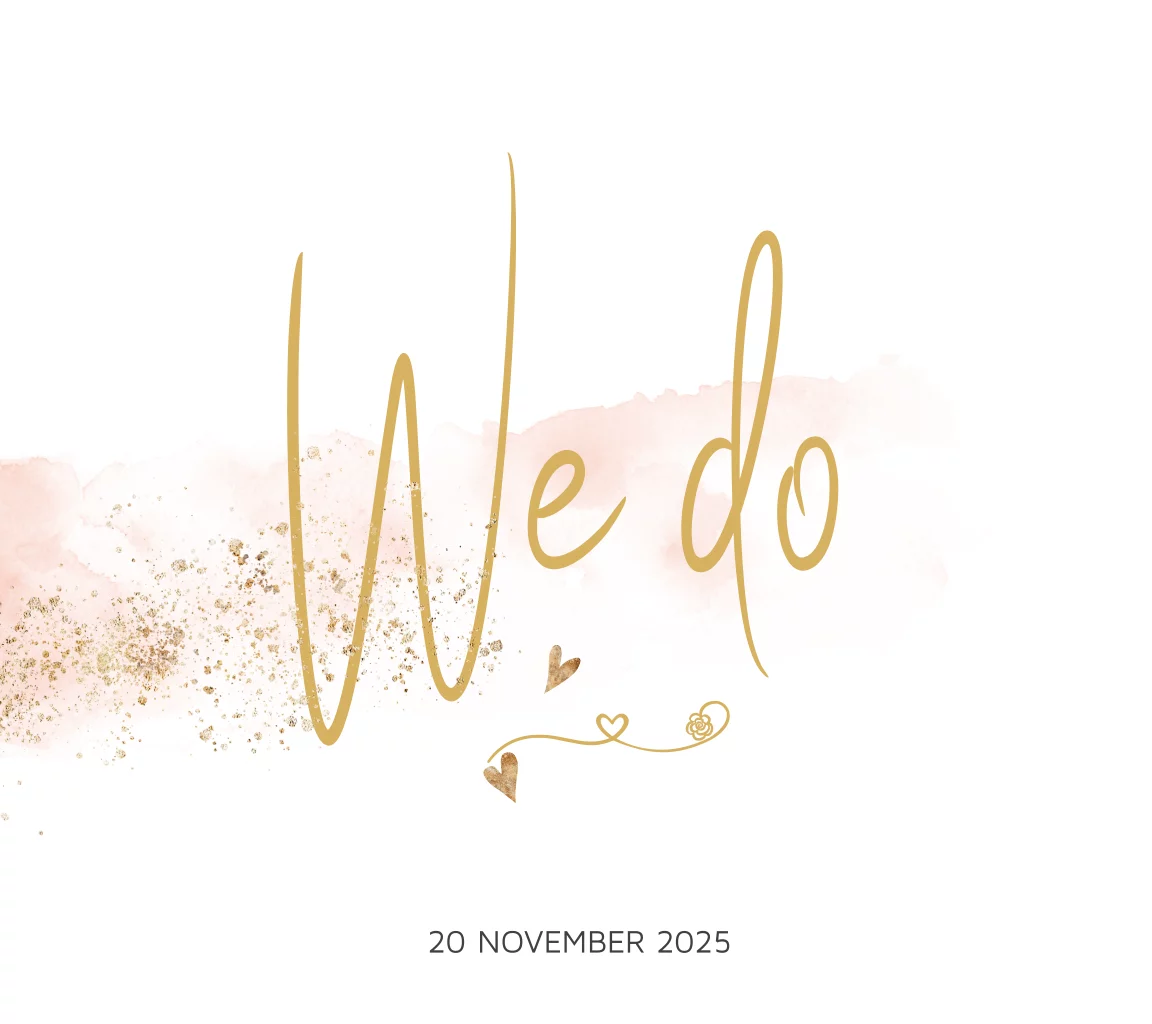 Een veeg van roze watercolour in combinatie met goudlook-stipjes en kleine hartjes; wat een stijlvol, romantisch trouwkaartje! Wat is jullie datum! Maak dit uitnodigingskaartje compleet met eigen teksten in de online editor en kies een bijpassende enveloppe.