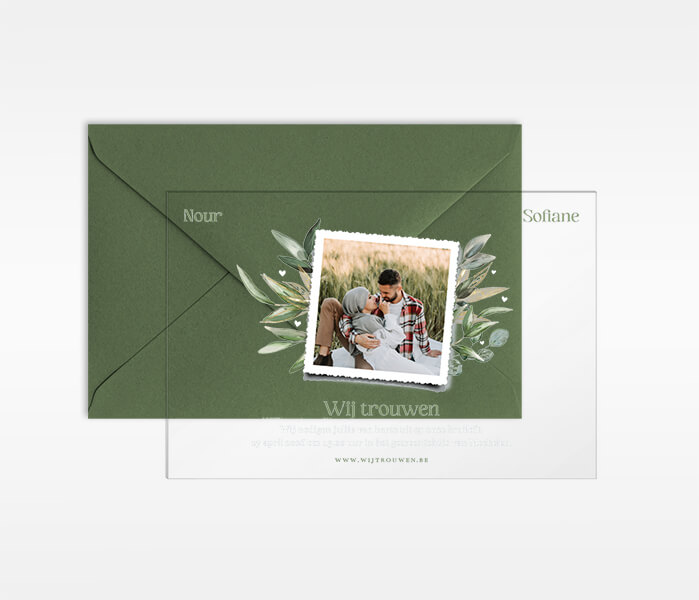 Trouwkaart met takjes, hartjes en foto