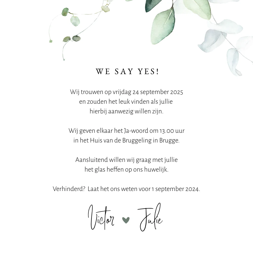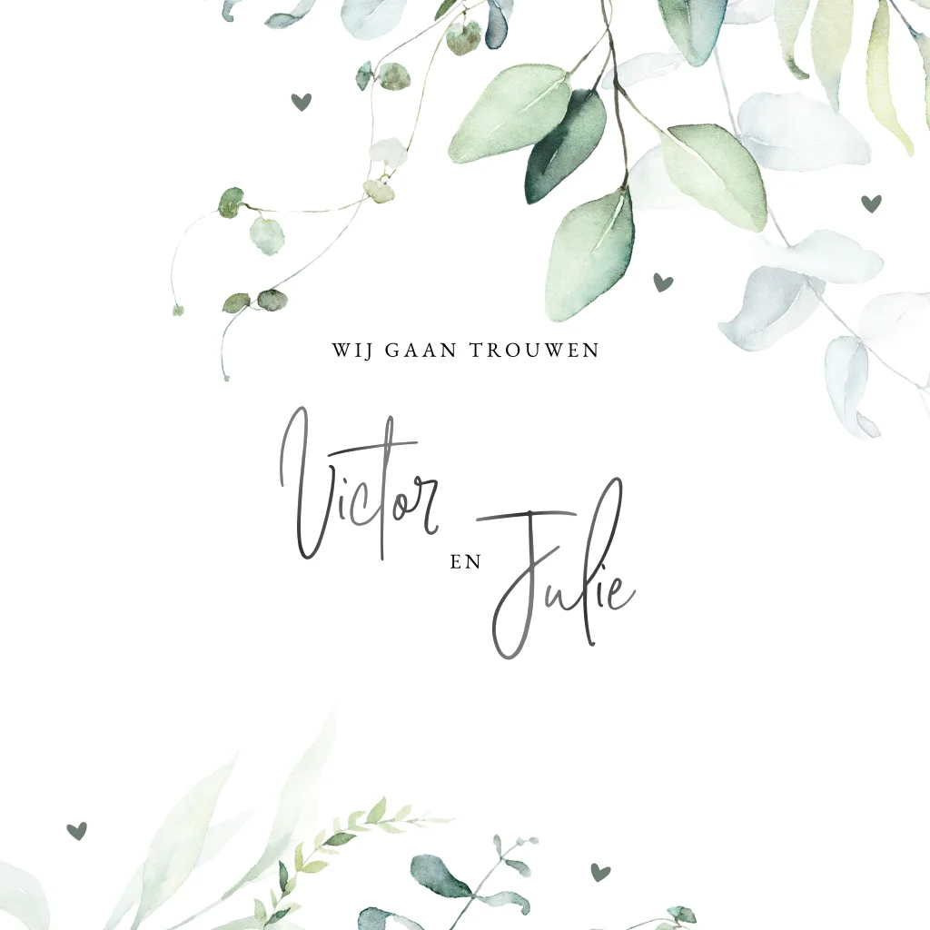 Dit botanische trouwkaartje heeft een stijlvolle uitstraling door de takjes in aquarel. De namen van het bruidspaar staan in sierlijke letters op de voorkant. Het kaartje is helemaal naar wens aan te passen.