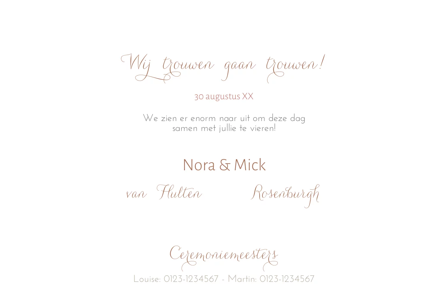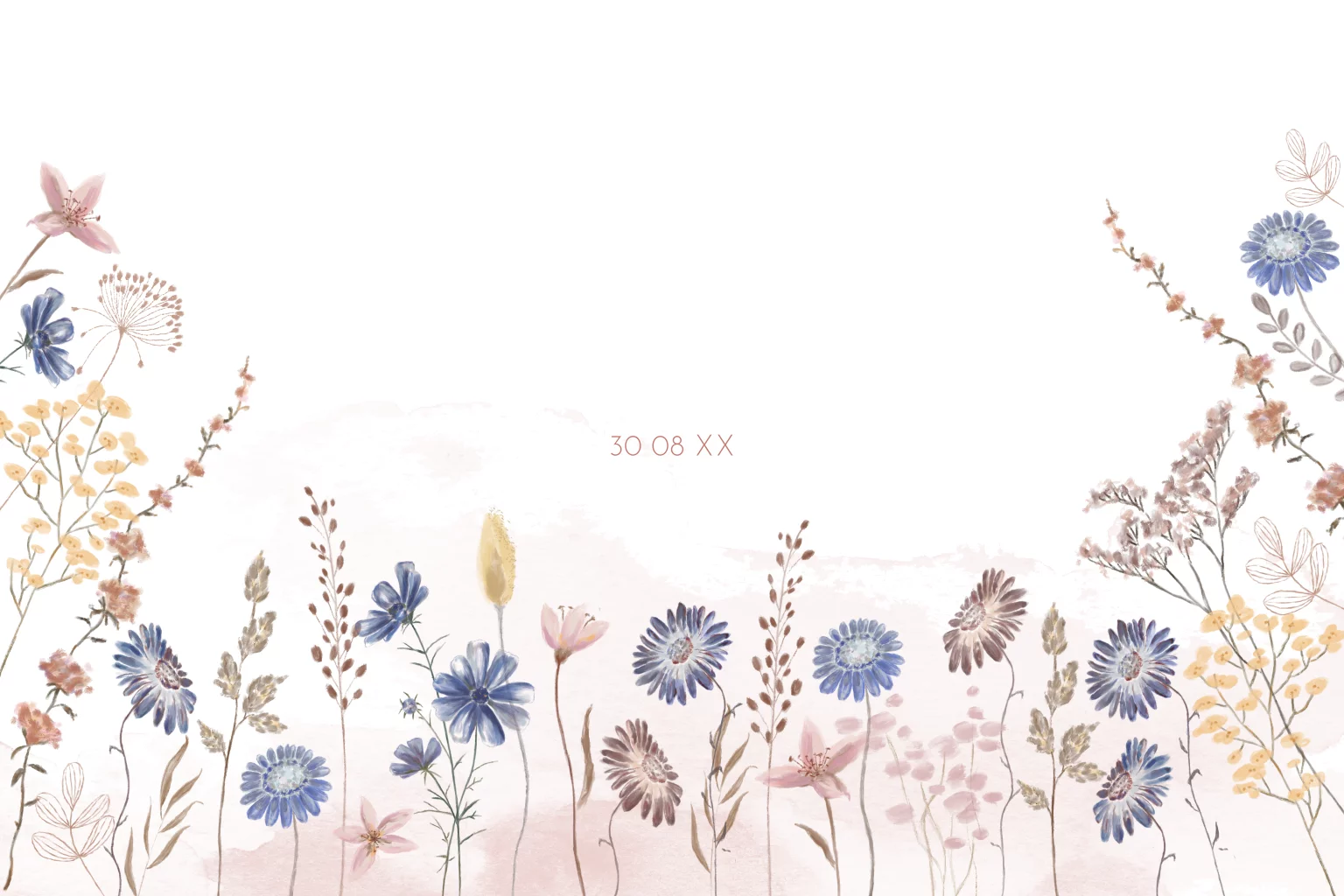 Mooie veldbloemen in paars, roze en geel sieren deze stijlvolle dubbele trouwkaart in liggend model. De bloemen staan op een achtergrond van roze waterverf, de namen van het bruidspaar staan in goudfolie druk. Aan de binnenzijde staan leuke icoontjes bij het dagprogramma en de verschillende typografie is in bijpassende kleur. Pas de kaart naar wens aan in de online editor.