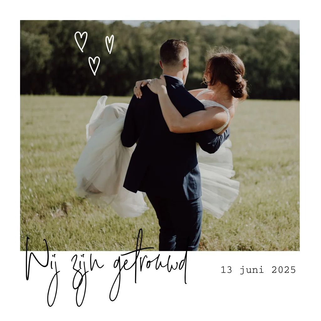 Een hippe 'wij zijn getrouwd' kaart met een wit kader. Met een sierlijke lettertype en hartjes als extra accent maak je de kaart helemaal af. In de online editor maak je de kaart helemaal naar eigen wens, zo gedaan!