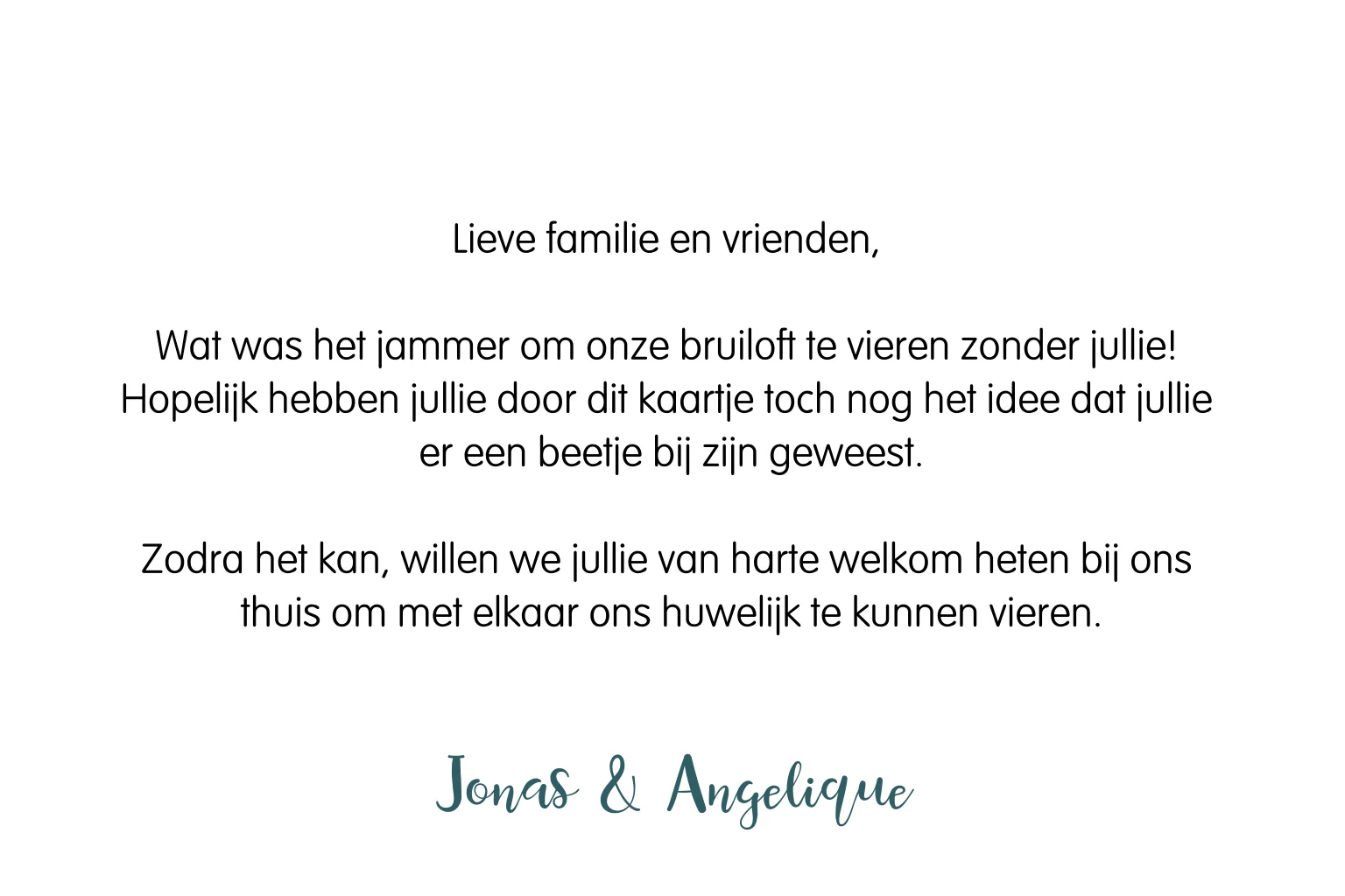 Mooie rustige 'wij zijn getrouwd' kaart met gekleurde tekst-vlakken afgewisseld met foto's. Op deze kaart is ruimte om verschillende foto's te uploaden. Kies in onze online editor voor een kleur en personaliseer de tekst in een lettertype dat bij jullie past. Aan de binnenzijde is ruimte voor nog een foto.
