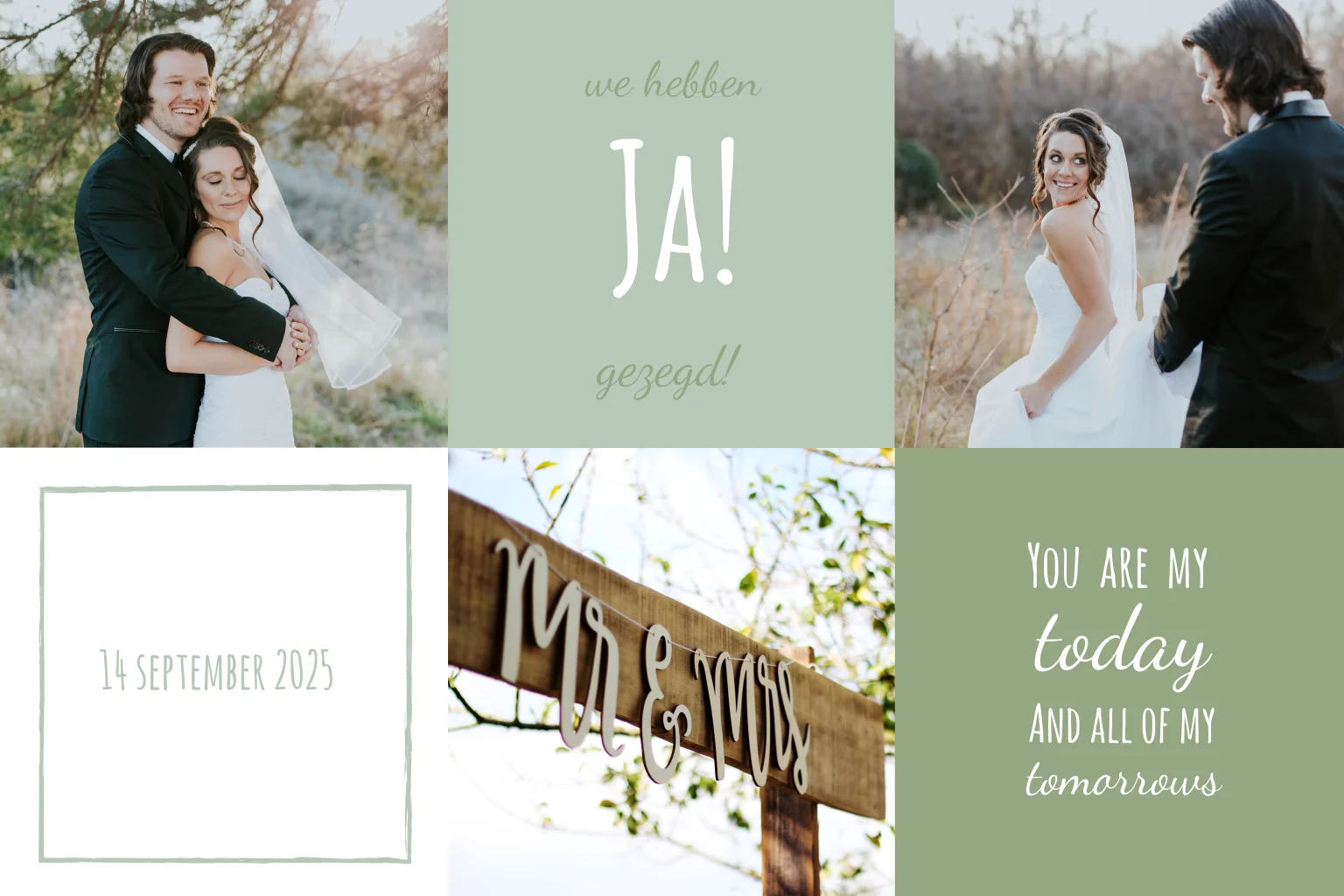We said yes! Hippe kaart om te laten weten dat jullie getrouwd zijn. In de vakjes kun je eigen foto's toevoegen van jullie dag. De teksten in de groene blokjes en op de achterkant kun je naar wens aanpassen in de online editor.
