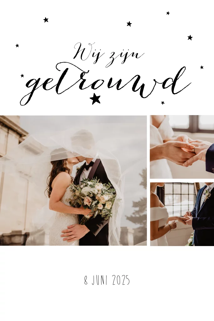 Laat iedereen weten dat jullie getrouwd zijn door middel van deze hippe kaart. De achtergrond is wit en heeft zwarte sterretjes. Voeg drie persoonlijke foto's toe van jullie tweetjes en maak daarmee de kaart helemaal persoonlijk.