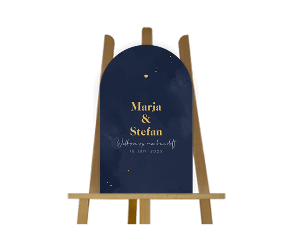 Heet de gasten op jullie bruiloft welkom met een bijpassend bruiloftsbord, dit donkerblauwe bord is in mooie boogvorm, de tekst is in goudgeel en wit in modern lettertype. Boven de namen staat een klein hartje, romantisch!