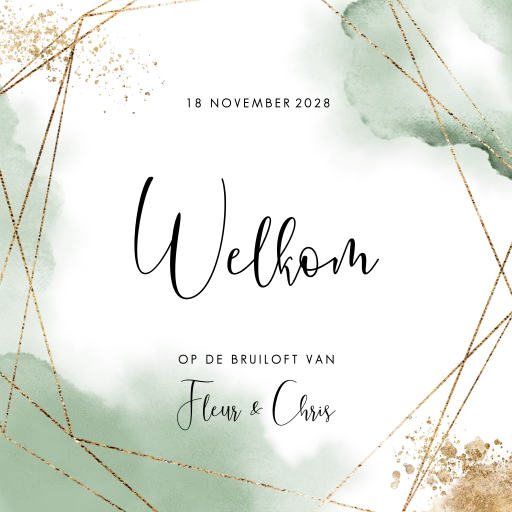 Heet de gasten van jullie bruiloft welkom met dit chique welkomst bord in de stijl van jullie trouwkaart, stijlvol! In de hoeken goudkleurige geometrische lijnen en goudspetters op een achtergrond van groene aquarel.