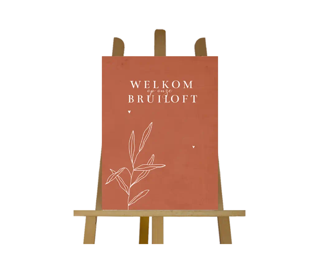 Dit welkomstbord met een diep oranje achtergrond verwelkomt jullie gasten in stijl. De witte lijntekening van een tak met zwevende hartjes voegt een hippe en elegante touch toe.| Totaalprijs: 0 |