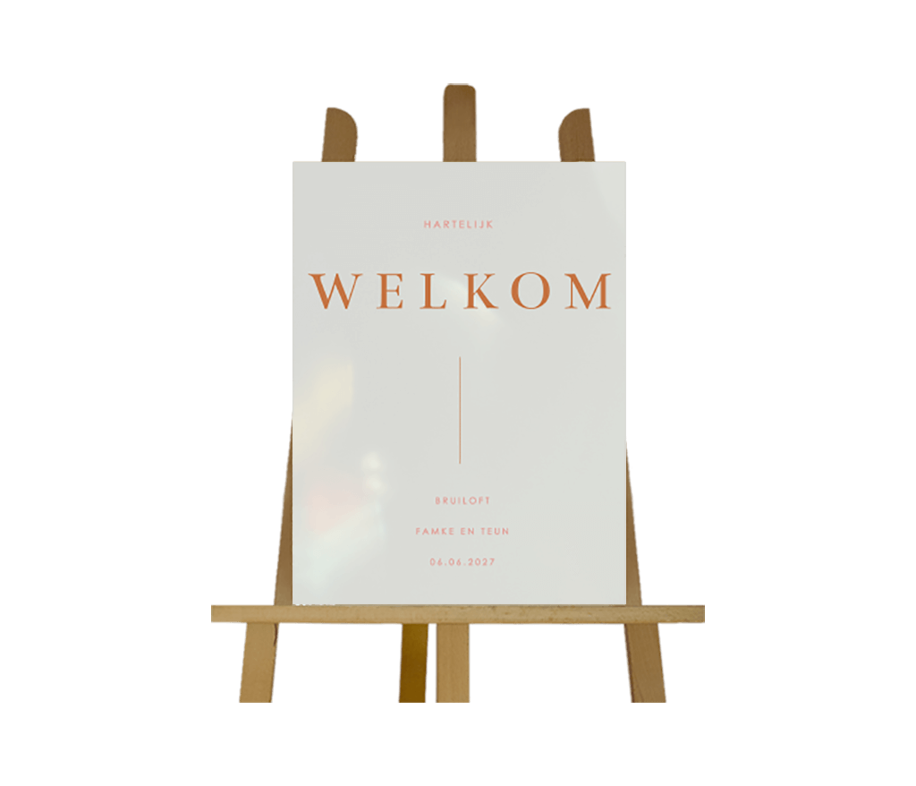 Een welkomstbord van acryl glas en oranje kleurige tekst. Acryl glas betekend dat het bord doorzichtig is.