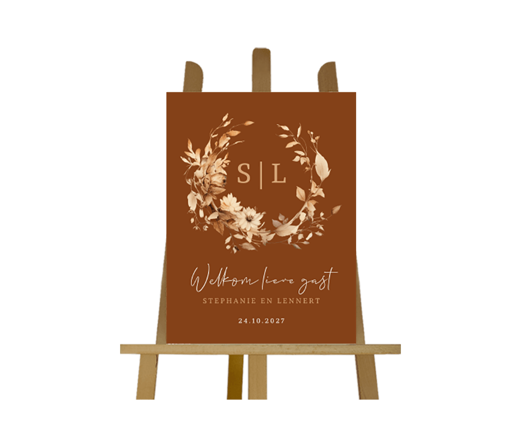 Heet de gasten van jullie bruiloft welkom met dit stijlvolle bord in bohemian stijl in roodbruin met een krans van droogbloemen en takjes in beige en de initialen van het bruidspaar in de krans.