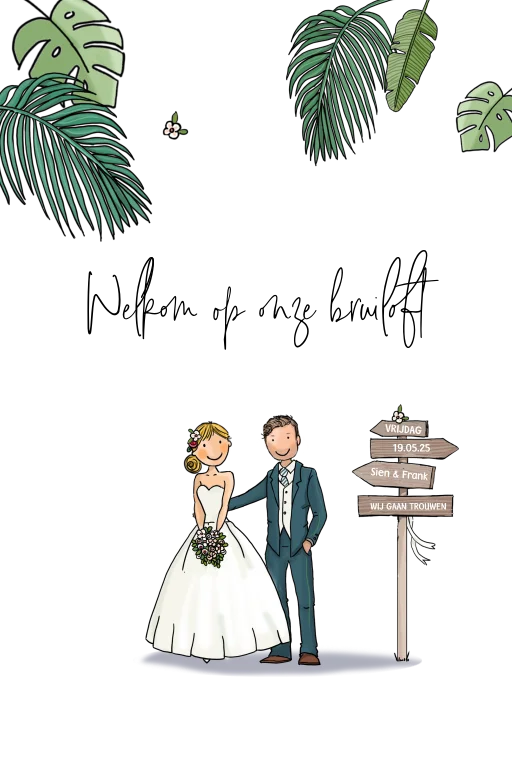 Vrolijk welkomstbord met botanische bladeren en getekend trouwkoppel.