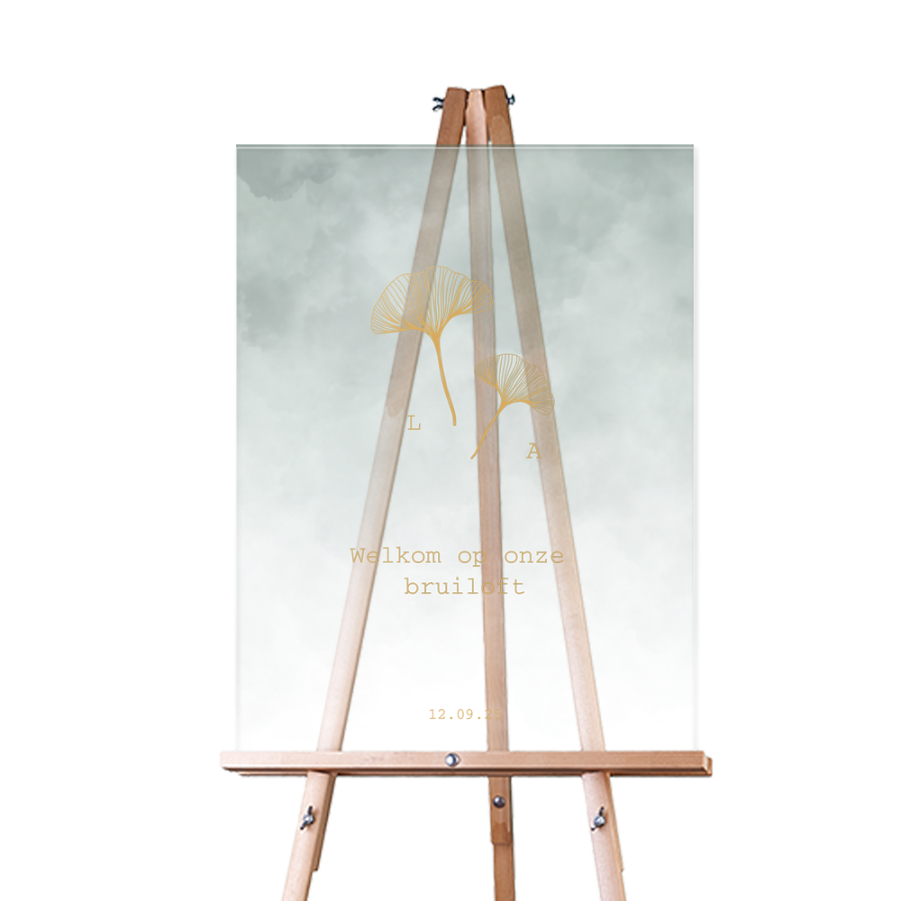 Chique bord van acryl om de gasten op jullie bruiloft welkom te heten, op een groenig gewolkte achtergrond staan getekende ginco bladeren.