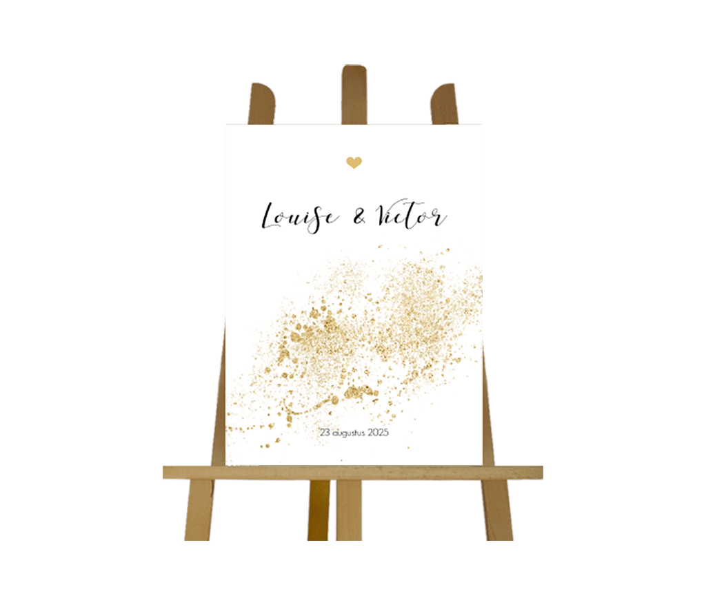 Staand welkomstbord met spetters in goudlook en een hartje boven de namen van het bruidspaar.