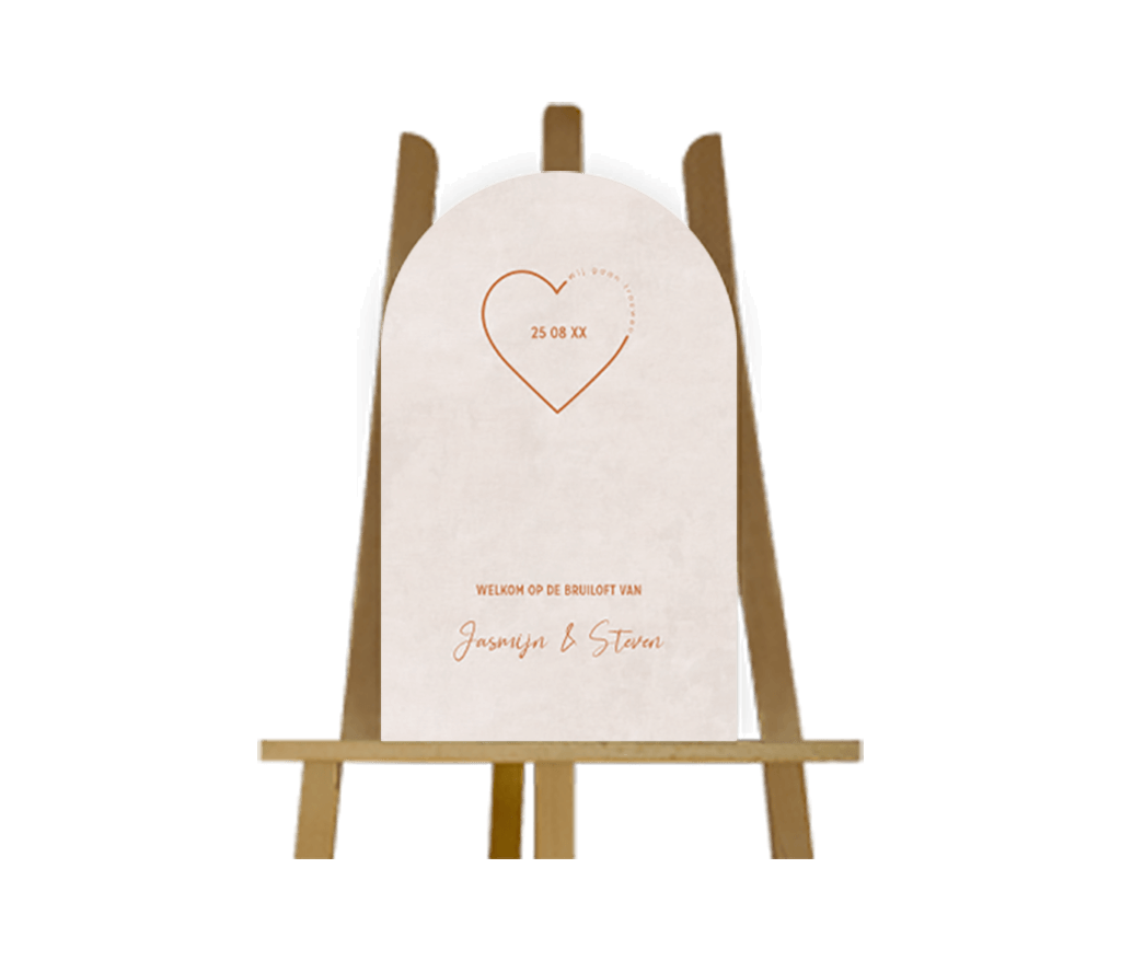 Een stijlvol bruiloftsbord om de gasten op jullie bruiloft welkom te heten. Het bord heeft een boogvorm.