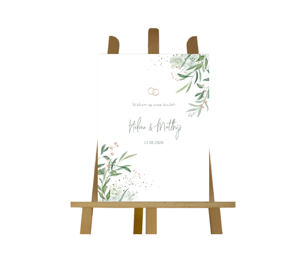 Welkomstbord met vrolijke takjes en roze bloemen. Verwelkom jullie gasten met dit bijpassende welkomstbord