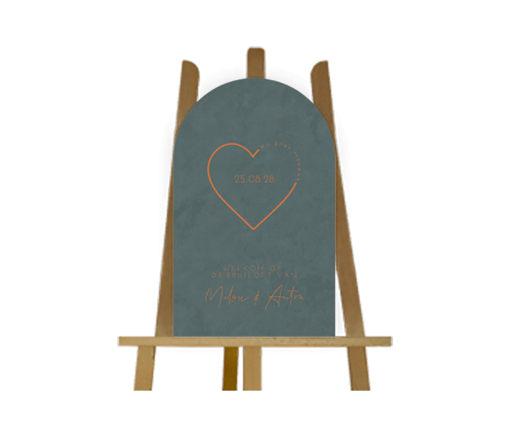 Een prachtig welkomstbord met een velvet-look blauwgrijze achtergrond. De tekst en het hartje zijn in goudkleur.