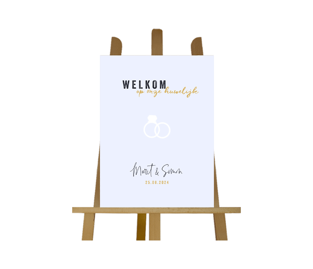 Heet de gasten op jullie bruiloft welkom met dit bord in de stijl van de trouwkaart. Op de zachtblauwe achtergrond staat de tekst in zwart in geel in trendy letters. In het midden een icoontje van twee trouwringen in wit.
