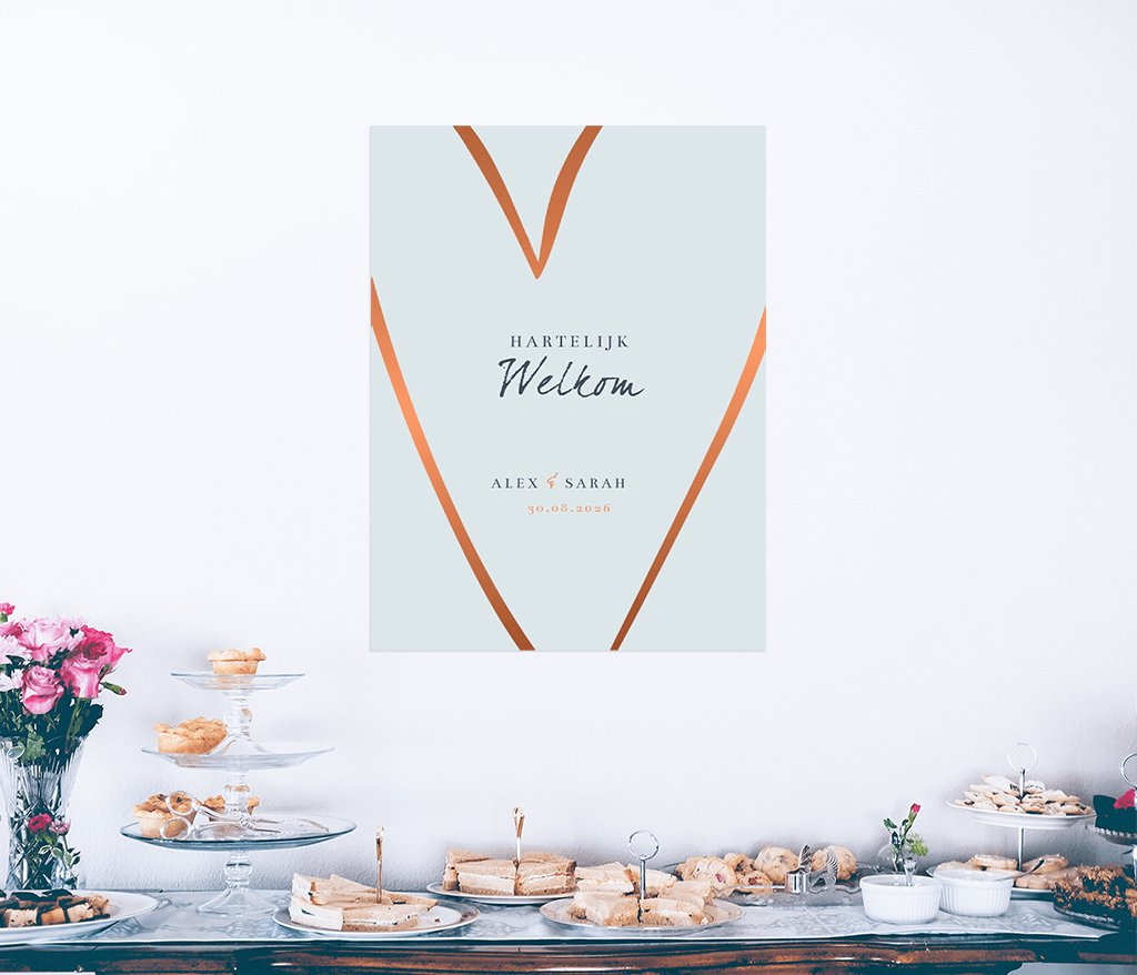 Stijlvolle poster om de gasten op jullie bruiloft welkom te heten, past helemaal bij de trouwkaart met het grote hart. Op de zachtblauwe achtergrond staat de tekst in zwart in een groot, koperkleurig hart.
