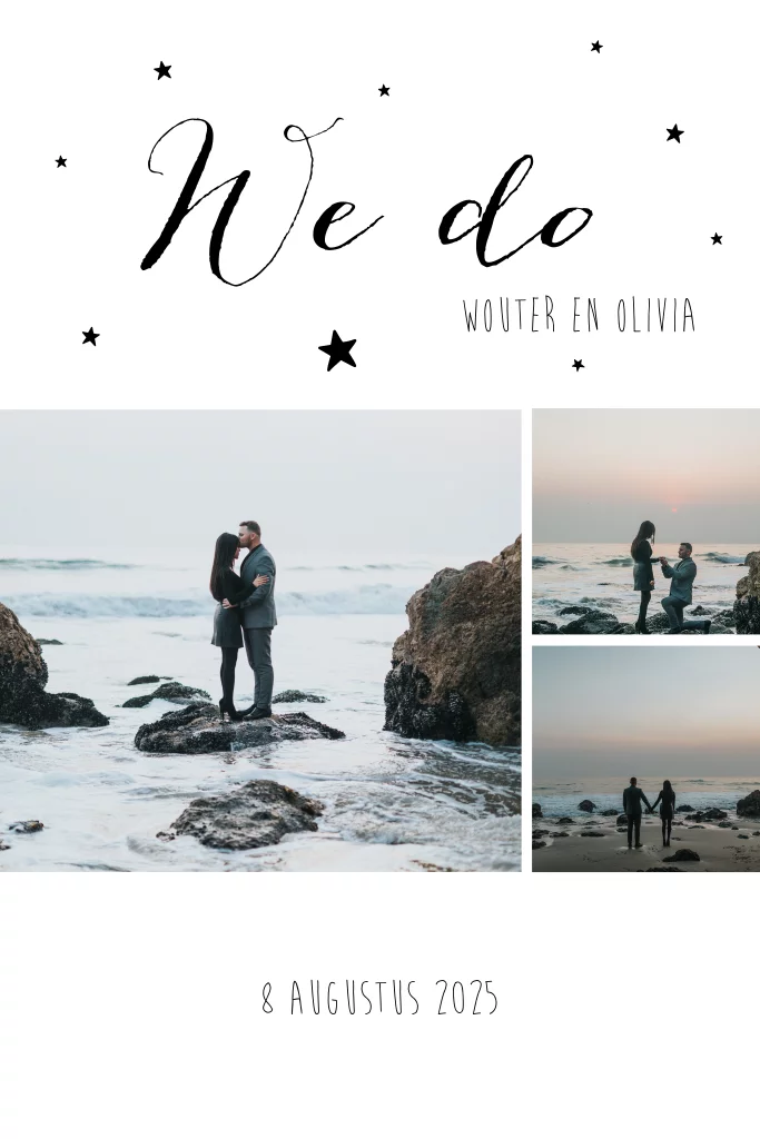 Trendy uitnodiging voor jullie trouwdag met ruimte voor een leuke fotocollage op de voorkant en een foto aan de binnenkant. Boven jullie namen staat in groot lettertype 'We do' tussen de sterren. Maak je eigen ontwerp in de online editor en maak er een uniek exemplaar van!
