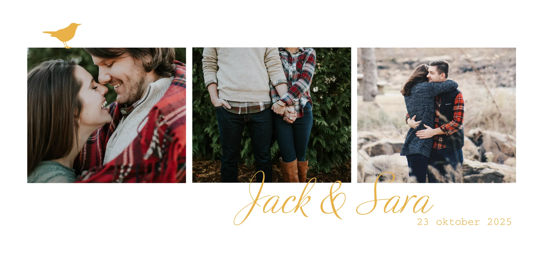 Stijlvolle trouwkaart met sierlijke letters en drie foto's naast elkaar op de voorkant. De letters en het vlak op de achterkant hebben een mooie goudgele kleur. Op de achterkant is ruimte voor nog een foto, de kleine takjes en de vogeltjes maken de kaart helemaal af! Pas zelf kleuren en teksten aan en maak je eigen ontwerp in de online editor.