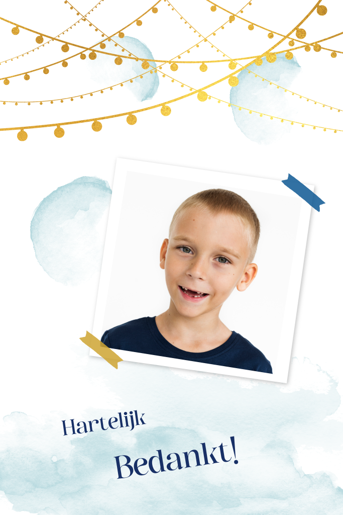 Bedank de gasten van de communie of vormsel met een persoonlijk kaartje met leuke foto. Op de witte kaart staan blauwe waterverf vlakken met feestelijke goudkleurige lampjesslingers erboven, maak de kaart compleet in de online editor.
