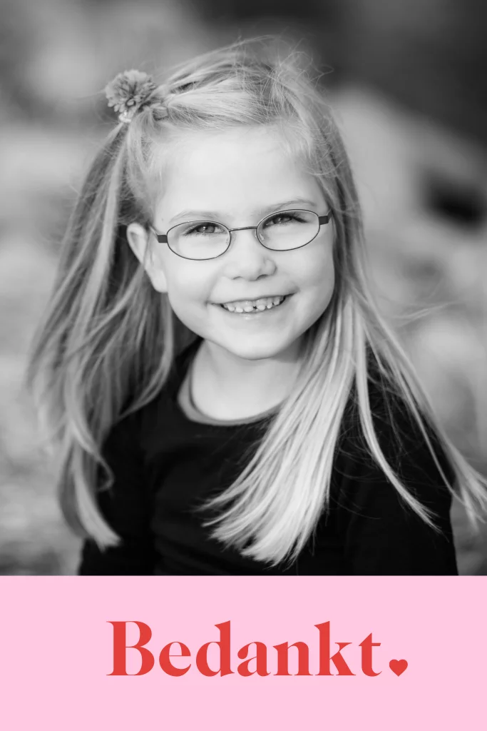 Hippe bedankkaart voor de communie in vrolijke colourblock kleuren roze en rood. De tekst is in stoer lettertype met een lief hartje ernaast. Upload een leuke foto van jullie dochter en maak er een persoonlijk bedankje van in de online editor!