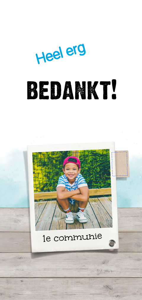 Een vrolijke communie bedankkaart met foto en een gekleurd vlak eronder. Op de achterzijde staat 'bedankt' in groot lettertype in dezelfde kleur. Je kunt kleuren, teksten en afbeeldingen zelf aanpassen in de online editor. Zo gedaan!