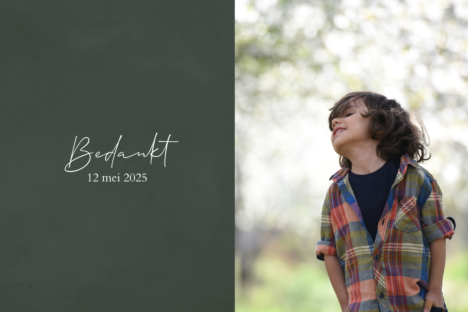 Eenvoudig maar stoer, dit bedankkaartje voor de communie van een jongen! De liggende kaart is verdeeld in een vlak met een foto en een donkergroen kleurvlak. De tekst 'bedankt' is in goudfoliedruk, dat komt mooi naar voren op de groene ondergrond. Op de witte achterzijde is ruimte om de tekst van het bedankje te plaatsen, maak het kaartje geheel naar eigen wens in de online editor.