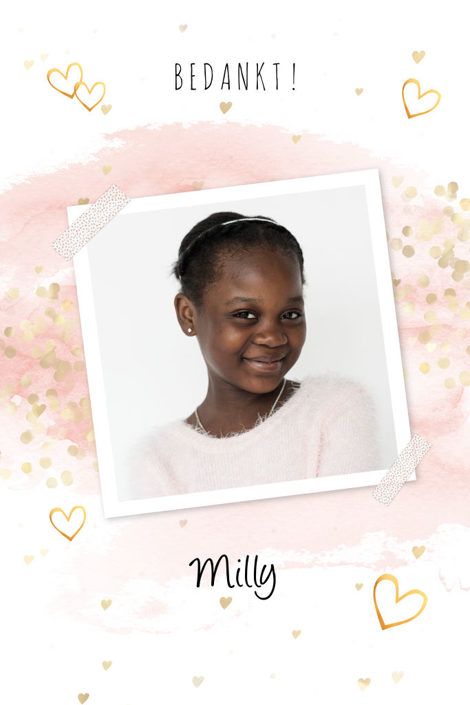 Een mooie kaart om je gasten te bedanken voor hun aanwezigheid bij het communie feest of vormsel. Op de witte kaart staat een roze vlak van waterverf met een foto in polaroid stijl. De goudkleurige hartjes en goudspetters maken de kaart extra feestelijk, pas tekst en foto naar wens aan in de online editor.