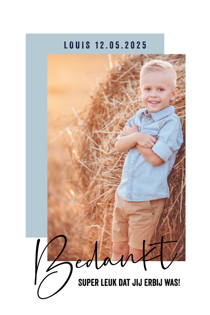Maak een stoer bedankkaartje voor de communie van jullie zoontje. Op de staande witte kaart is ruimte voor een eigen foto op het blauwe vlak, pas de kaart naar wens aan in de editor.