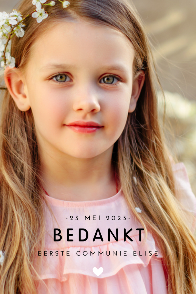 Mooie bedankkaart communie met een grote foto op de voorzijde. Over de foto staat de naam, datum en bedankt in zwarte trendy letters. Het kleine hartje is in goudfoliedruk, dat valt mooi op! Op de witte achterzijde kan de tekst van het bedankje worden geplaatst, pas deze eenvoudig aan in de online editor.