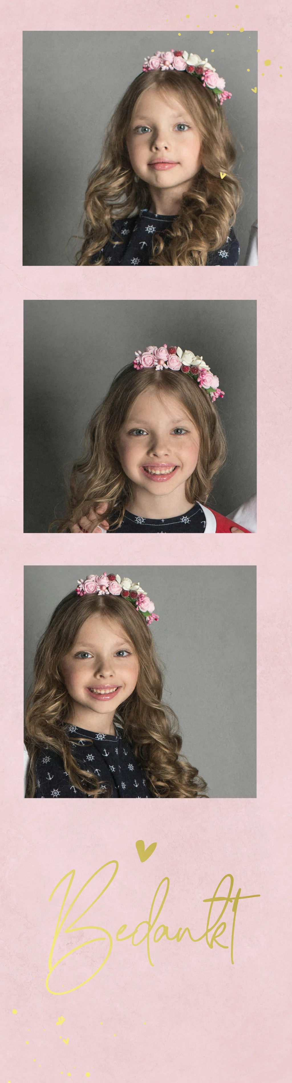 Originele bedankkaart voor de communie in de vorm van een fotostrip die als boekenlegger is te gebruiken. Op de roze achtergrond is ruimte voor drie foto's, de tekst eronder staat in luxe goudfolie.