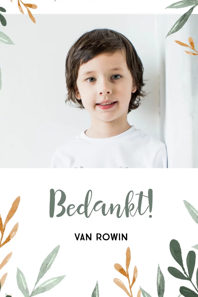 Botanische bedankkaart communie voor een jongen. De foto wordt omlijst door mooie takjes in groen en geel. Met een modern lettertype is deze kaart helemaal hip, pas het ontwerp eenvoudig aan in de online editor.