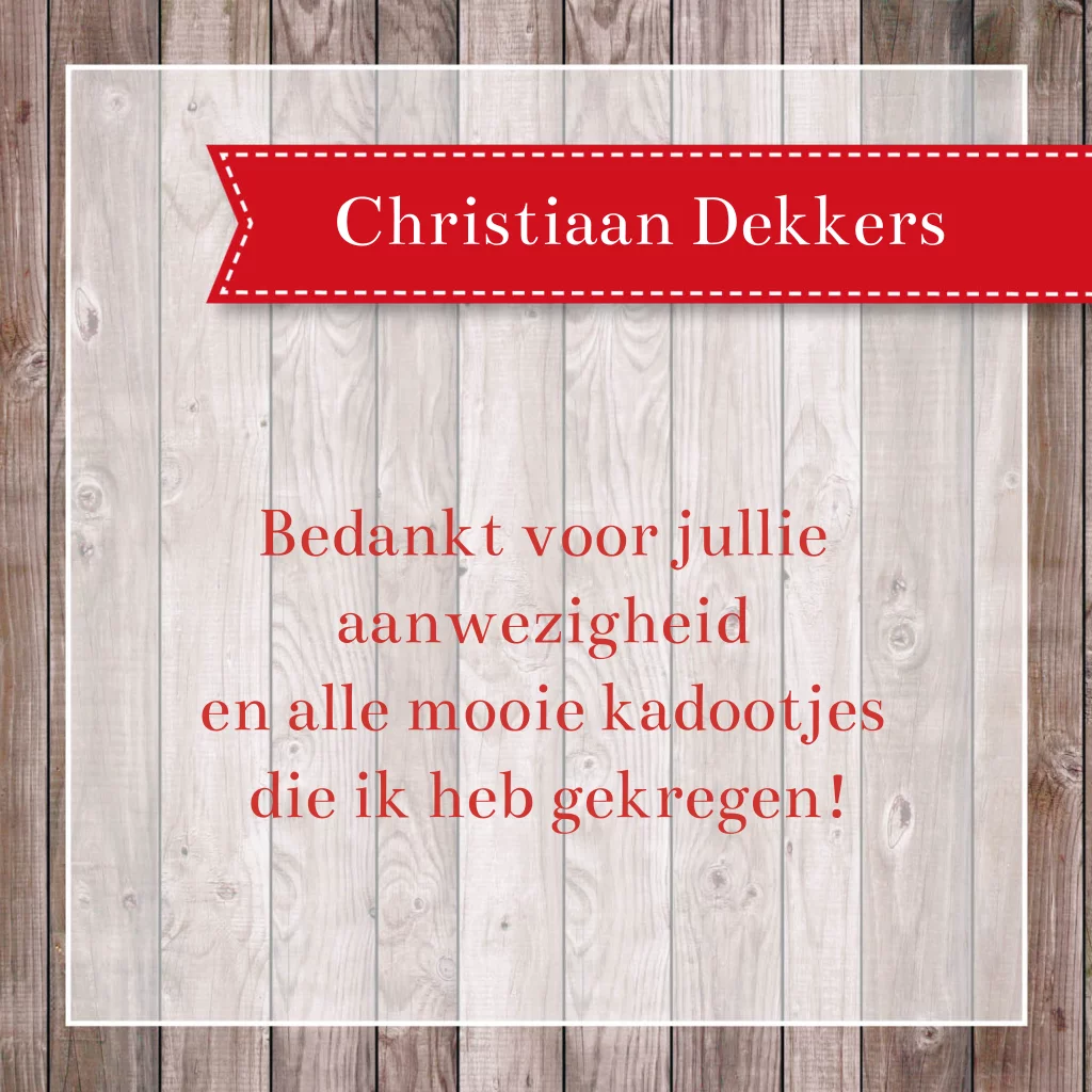 Originele bedankkaart voor de communie van je zoontje. De houten achtergrond maakt deze kaart echt stoer! Plaats foto's van de communie op de voor- en binnenkant en schrijf je eigen tekst. De kleur van het rode etiket kan worden aangepast.