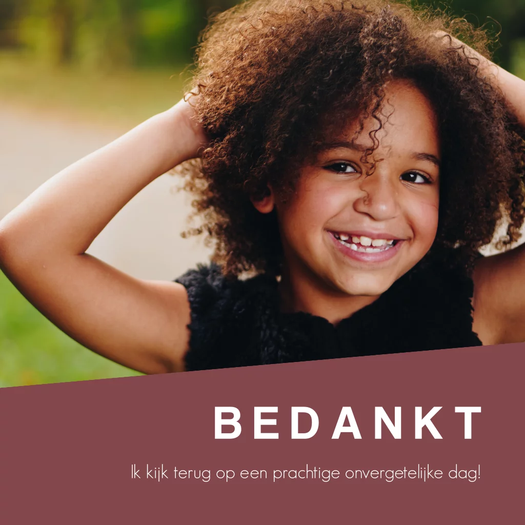 Een vrolijke communie bedankkaart met een grote foto op de voorkant en een gekleurd vlak eronder. In onze online editor kun je kiezen uit verschillende kleuren en lettertypen om deze bedankkaart helemaal eigen te maken.