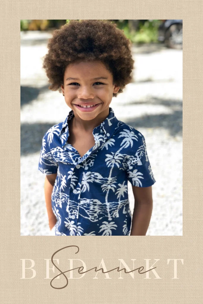 Bedankkaart communie in beige met ruimte voor eigen foto op de voorkant. Kies een leuke foto en maak de kaart persoonlijk in de online editor.
