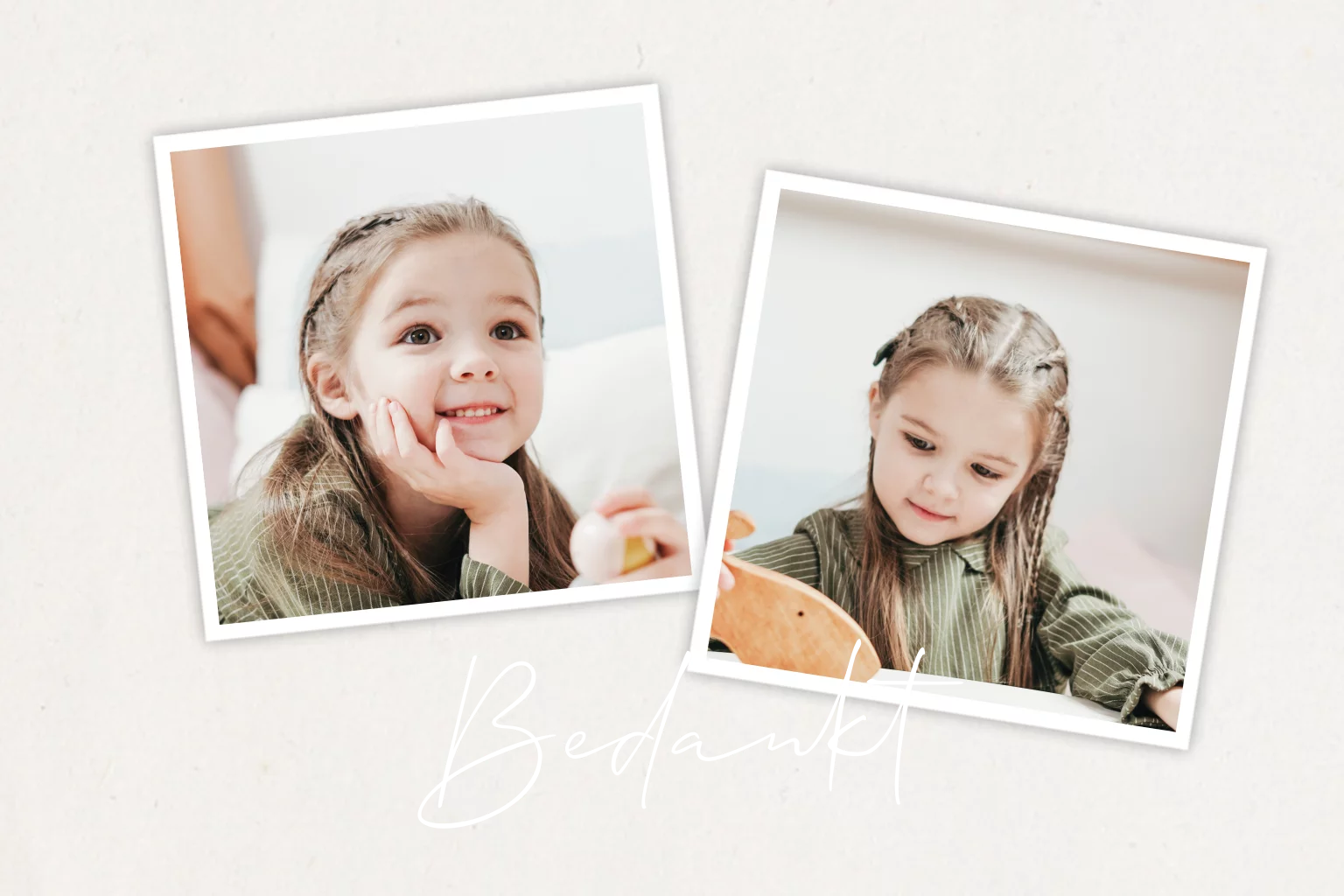 Lief bedankkaartje voor de communie van een meisje. Op de pastelkleurige achtergrond kunnen twee foto's worden geplaatst in polaroid-stijl. De tekst eronder staat in luxe roségoudfolie, dit komt ook terug op de achterzijde, waar de tekst voor het bedankje kan worden ingevoerd. Maak er een mooie persoonlijke uitnodiging van in de online editor!