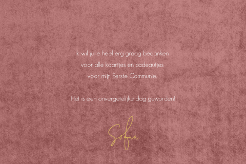 Mooi bedankkaartje voor de communie van een meisje in oudroze velvetlook. Op de voorkant kunnen twee foto's worden geplaatst, 'bedankt' staat in goudfolie, luxe! Op de achterzijde staat de tekst in wit en goudfolie, pas deze naar eigen wens aan in de online editor.