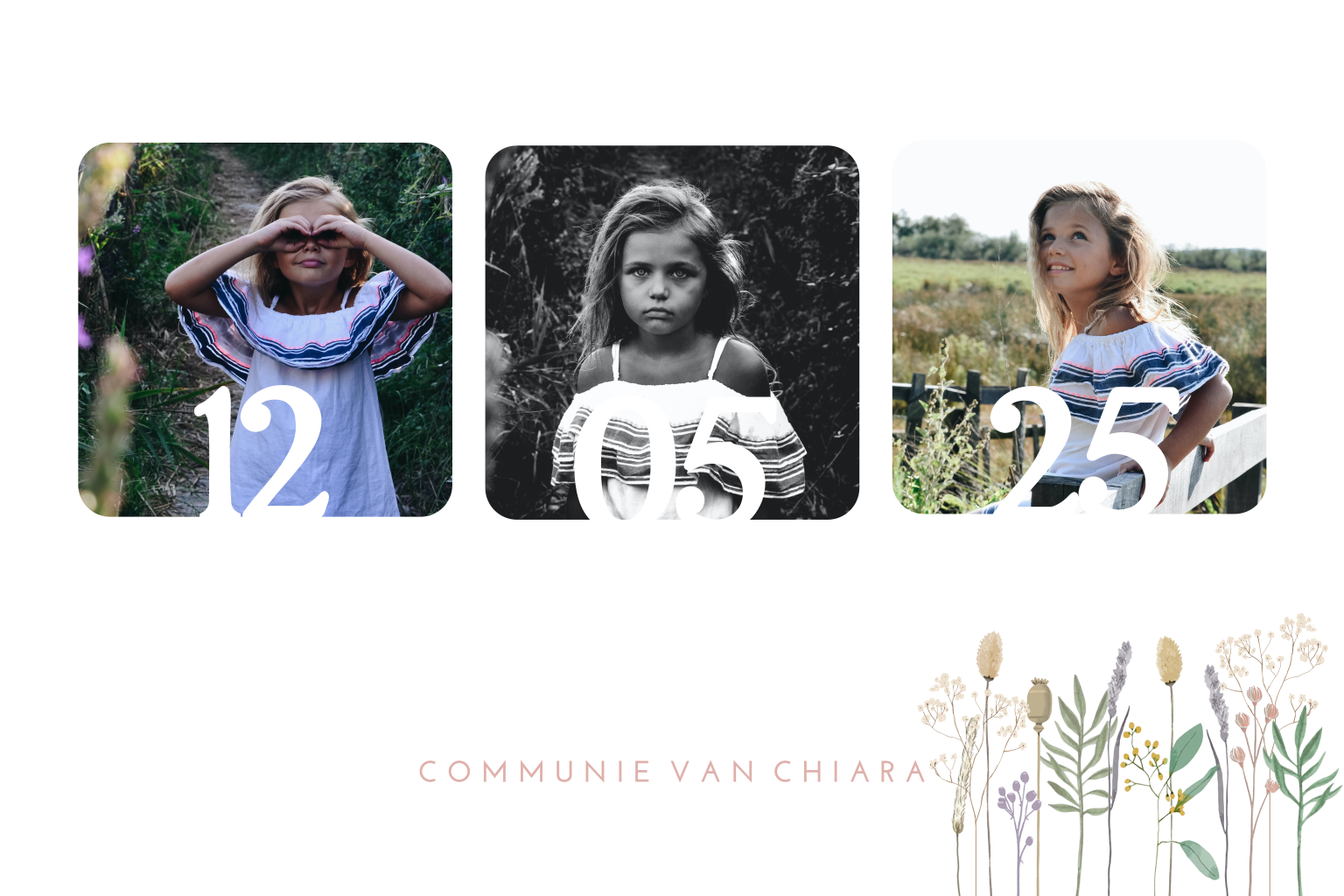 Bedankkaart met veldbloemen, drie foto's en communiedatum