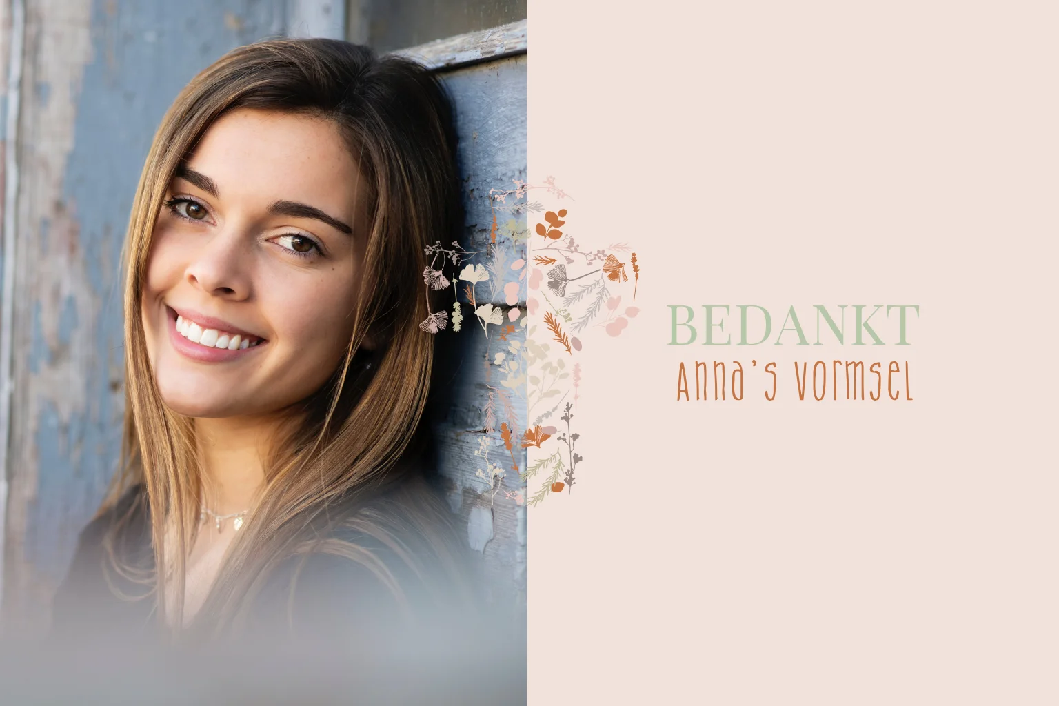 Bedank de gasten bij het vormsel met een origineel kaartje met foto. Op deze liggende kaart met afgeronde hoeken staat links een foto, de rechterkant is roze met ruimte voor de tekst. In het midden staat een kruis van allerlei christelijke symbolen.