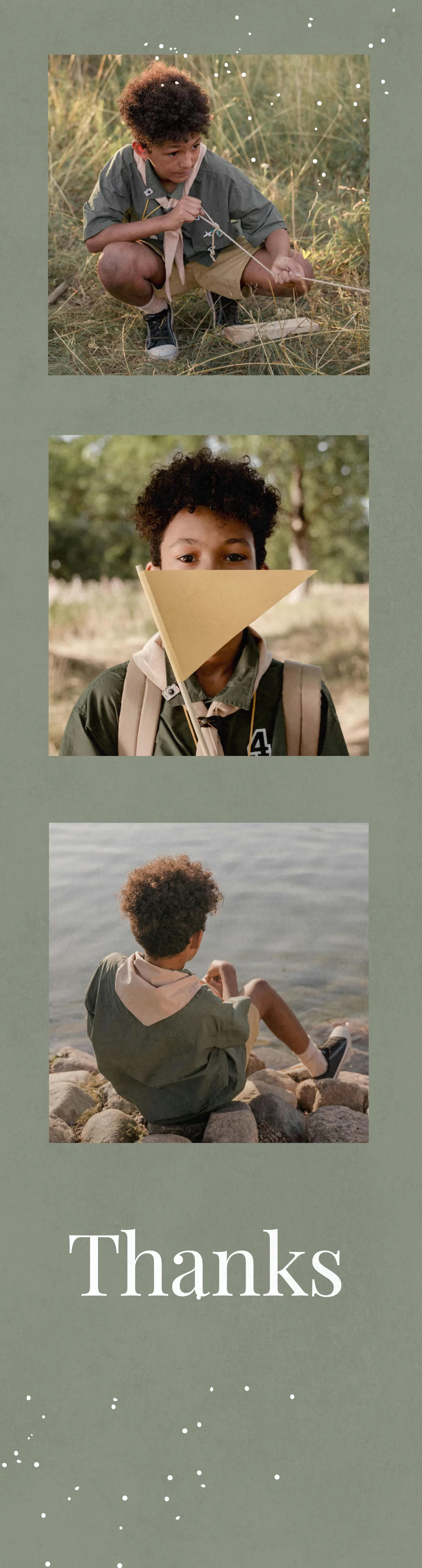 Originele bedankkaart voor de communie die als boekenlegger is te gebruiken. Op de grijsgroene kaart kunnen drie foto's worden geupload, de tekst staat in wit met puntjes eronder, pas de kaart naar wens aan in de online editor.