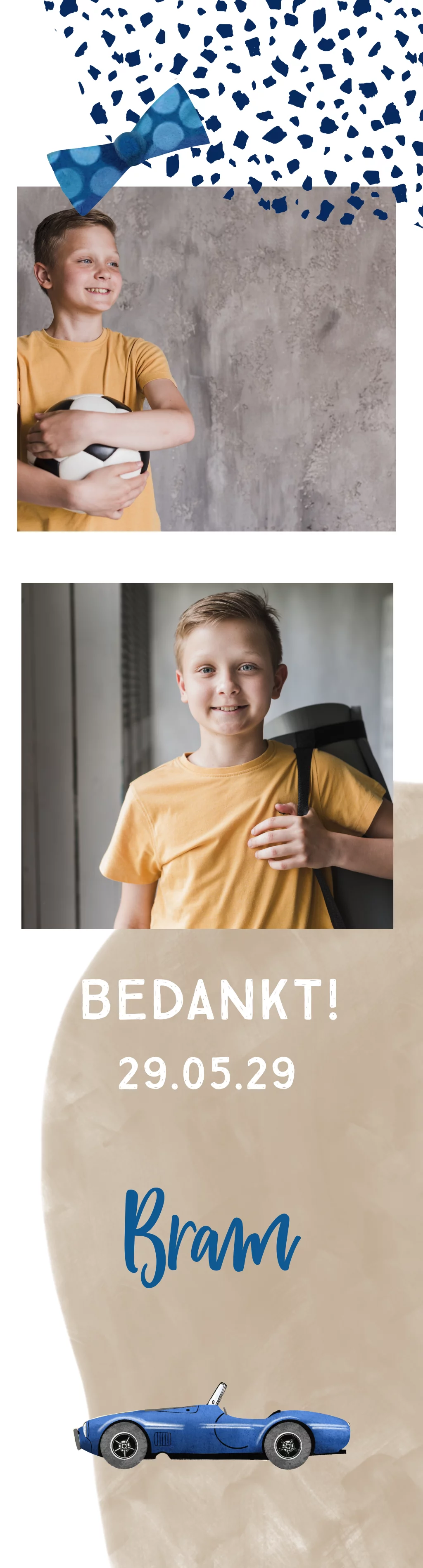 Boekenlegger jongen met blauwe auto en stik. Je kan de afbeeldingen van de boekenlegger zelf vervangen. De boekenlegger komt in een set van 4 stuks.