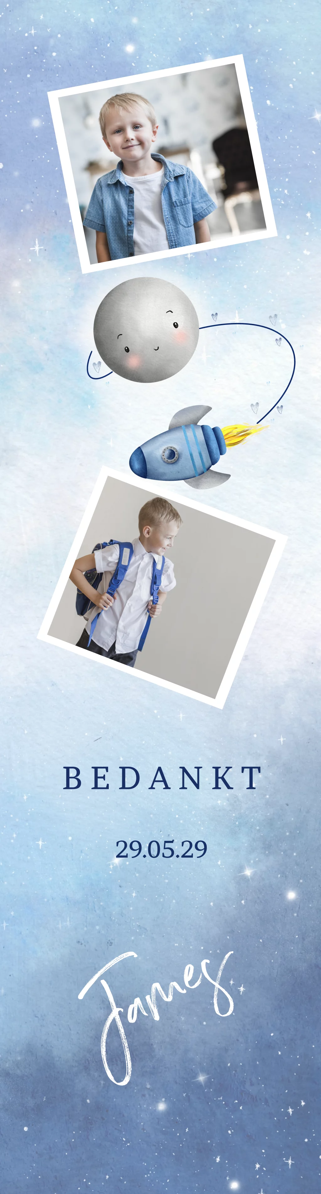 Boekenlegger voor een jongen met een galaxy achtergrond en de maan met een raket die eromheen vliegt. De boekenlegger komt in een set van 3.