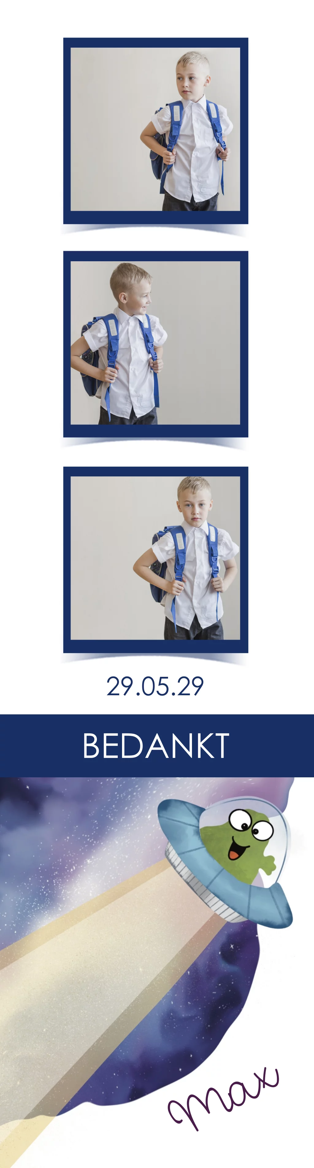 Boekenlegger met stoere Ufo en 3 luikjes waar je een eigen foto aan kan toevoegen.