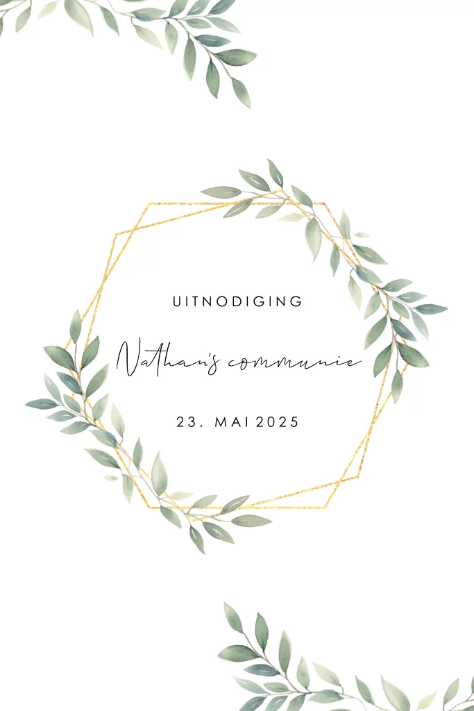 Een chique communiekaart met geometrische vormen en aquarelgroene takjes.