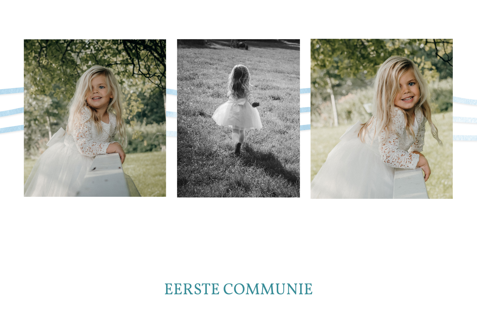 Maak een origineel bedankkaartje communie, op dit witte kaartje is ruimte om drie eigen foto's te uploaden in de editor. Achter de foto's staan blauwe golfjes, op de achterkant een gevouwen bootje. Een deel van de tekst staat in goudfolie, dat geeft een extra luxe accent.