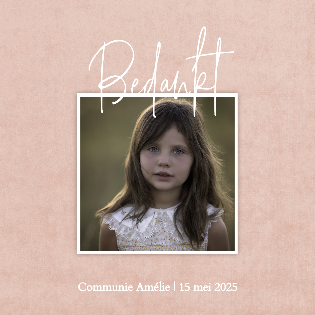 Lief, dit bedankkaartje voor de communie van een meisje! De foto in het midden staat op een roze velvet-look achtergrond, door de afgeronde hoeken krijgt het kaartje een extra zachte uitstraling. De tekst op de voor- en achterkant staat in witte hippe lettertypes, op de achterzijde staan nog lieve hartjes en spetters in wit.