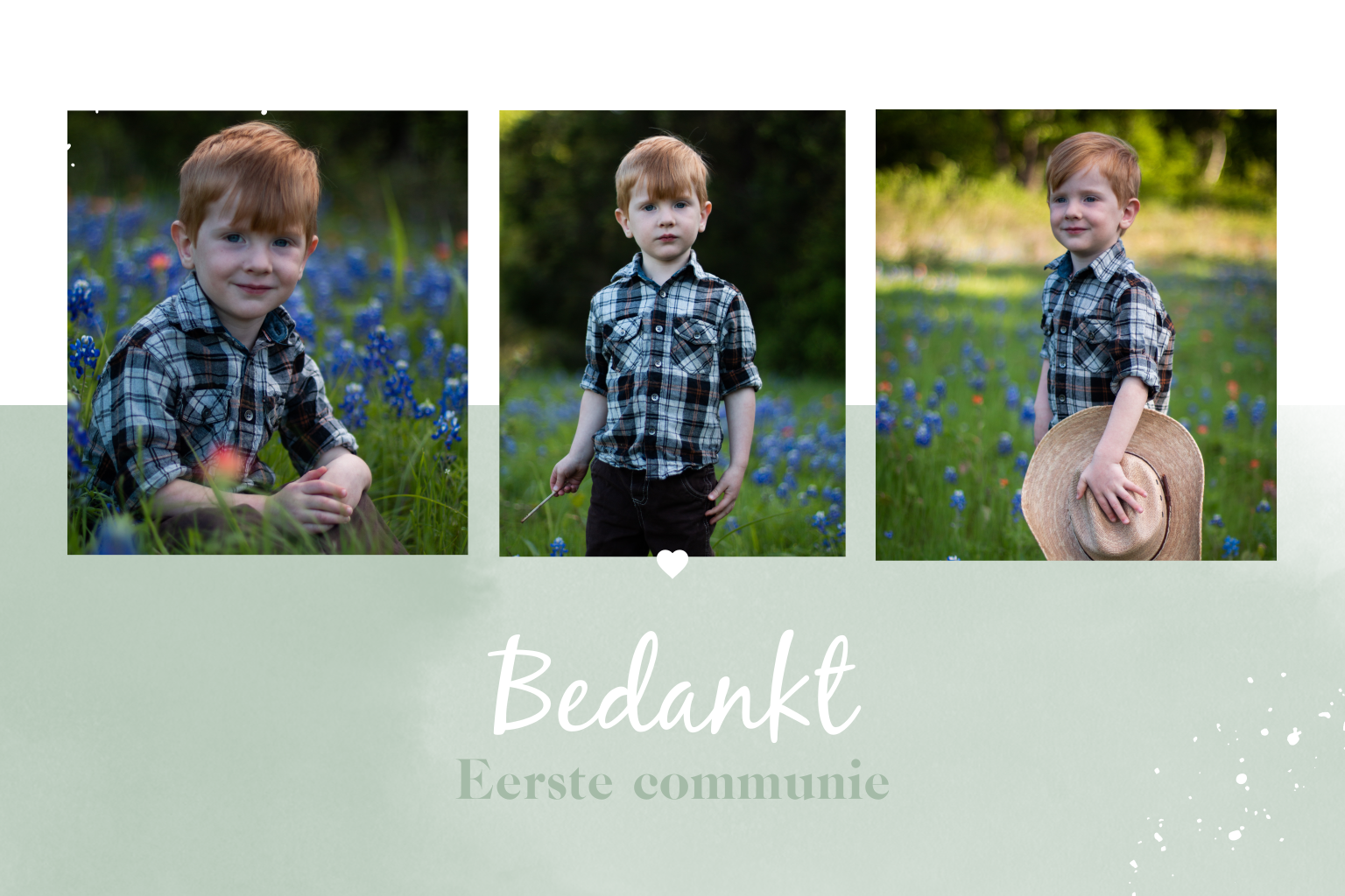 Leuk bedankkaartje voor de gasten van de communie, met ruimte om drie eigen foto's te uploaden in de online editor. De achtergrond is in wit met mintgroene waterverf en goudfolie spetters. Het kleine hartje geeft net dat lieve accent, mooi!