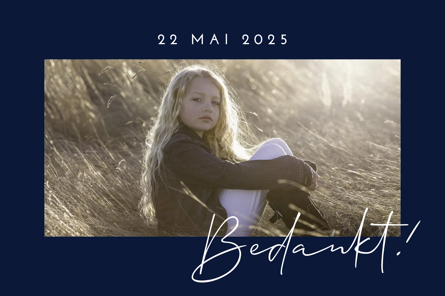 Hip bedankkaartje voor de communie van een meisje! Op de donkerblauwe achtergrond staat de tekst bij de foto in holografische folie. De achterkant van de kaart is in dezelfde kleuren als de folie, hier is ruimte voor de bedank-tekst, pas het gemakkelijk zelf aan in de editor.